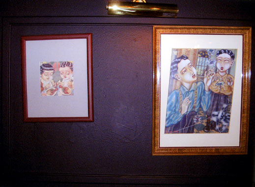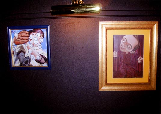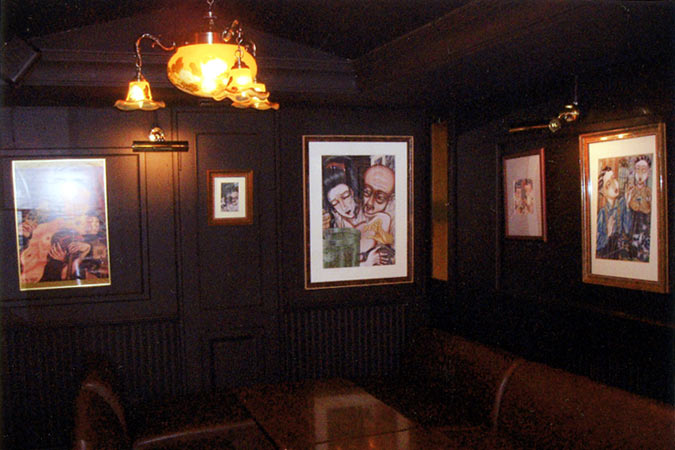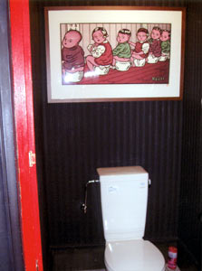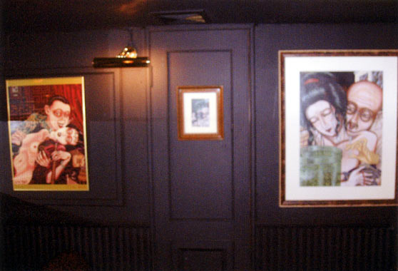 | 1999年作『不自由な食事』EPジャケットのお隣は、ゲルニカの楽曲『地球ゴマ』の元になった『地球ゴマ』原画。1985年作、作品集「AMNESIA」にも収録された この中で一番古い絵です。オーナーさんはこの空間で『地球ゴマ』を眺めながら『地球ゴマ』の曲を楽しまれているそうです。 |