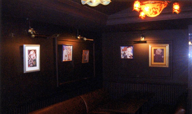 『Opium』ポスターの隣に映画「ドグラマグラ」より正木博士の原画セット。ポスター用にポスターに近い大きさで描かれた『笑う正木博士』と、テレカ用に小さめの『カメラを覗く正木博士』(テレカ大ほど小さくはありません)。カメラの絵はこのたび太田さんの手元を離れるにあたって加筆され、加筆後初公開!