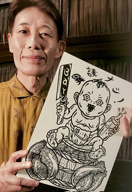 今回は “Dr. X”の原画の線描きのデータをまな板に乗せて 尻っぱしょりで大あぐら!「煮るなと焼くなと好きにさらせッ!」てことで金沢のデザイナーの方に画像を料理していただきました!