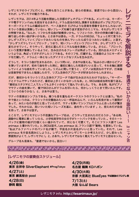 “レザニモヲ”は さあやと963の 若き(半分) 京都の鍵盤×ドラムスのたった二人の音楽ユニットです。