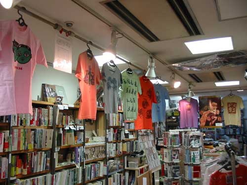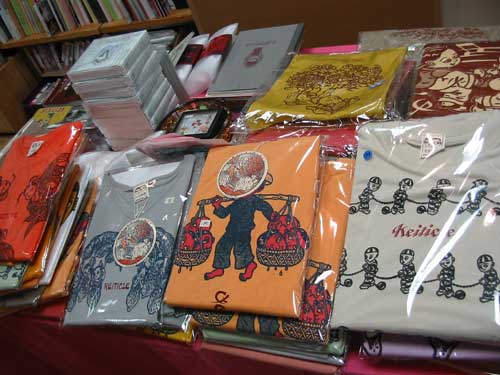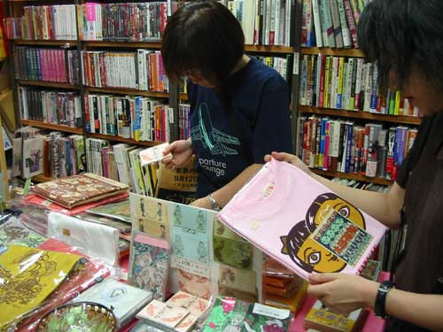 グッズを品定めのお客様 グッズは 手前左から Edibleトート カラシとピンク、 バッヂ、 ゲルニカBOX、 ポストカード "蛙と牛、 ミゼット封筒&カードセット、 シルク・スクリーン刷りポストカードセット、 装画を担当した文庫本「DEAR MONKEY」 |