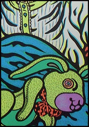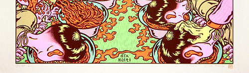 1995年、フランスで発表されたセリグラフ画集【LE GARGARISME】に収録、2003年の太田螢市場DMにも起用された絵。そのDMとこのポスターとはほんの少し違っています。太田さんはこの作品もいずれ大判セリグラフ化するべく少し手を加えていましたが、日本では個人がセリグラフを多種制作するのはとても大変なため先送りになっていました。そんなある日、フランスから届いた包みから現れ出たのがこの特大セリグラフ。太田さんの絵が大好きな Le Dernier Cri のパキートさんがいつの間にか特大ポスターに… 太田さんの絵をフランスでセリグラフにというお話は了解していながら、どの作品をとは訊ねていなかったのでした。ということで、フランス版の元になった絵は、以前、太田さんから送られていたもの。DMは少々の加筆後の原稿が使われました。