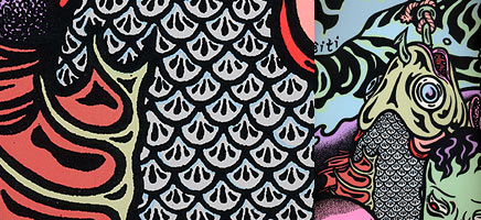 『卵割り』の事を語ろう。この作品は僕の作品では最もニューロティックな絵。90年代後半の作で画集 ”LE GARGARISM” の為に描いたもの。妊娠中の女性が不安定な気分から次々とわけもなく卵を割ってしまうといった内容。妊娠と卵の関係を連げている。お腹の大きさを意識される為 低い位置から見上げる形にしようと決めたがそうすると割った卵を見せられない事で長時間悩んでガラスのボウルにする事に決めたが服装や髪型のクラシックさとガラスボウルの相性がどうなのかちょっとわだかまりつつ、つらつらとやり過ごした。窓のカーテンの流れは、お腹の子への天からの恩愛とエネルギーがおりてきているのをイメーヂさせている。窓が開いているのは未来へ向かっての産道であり外の電柱のツバメは西洋絵画の受胎告知に象徴的に使われているモチーフである。壁の節穴は性的な暗示と彼女のおちつかない精神状態を表す位置取りであり画面のリズムともなっている。それら様々なエッセンスをぐいとひとまとめ! 線の一本一本 細をうがちながら描き上げた。妊娠のニュアンスを得る為に自分のお腹にクッション入れてみたりもしてみた。今見ても隙なくよく張りめぐらされた作品とは思うが、色が…。