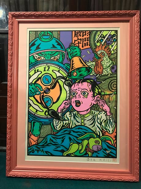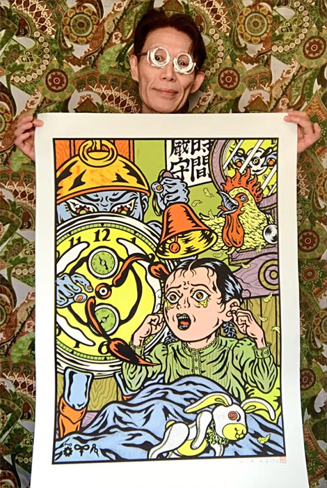 それに合わせて以前シルクスクリーンプリントされた私のポスターのうち、このポスター「悩まし時計」 洋題 “Punctual Clock” が刷り色を変えサイズがよりラージになって再プリント! 先日 海を超え私の所に入荷しましたのでさっそく販売いたします。
