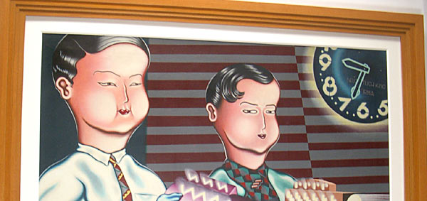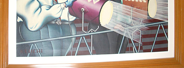オーバーホール作業は30年が経ってるうえ長く暗いところで眠っていたお寝坊作品なのでさすがに状態はかなりイカレていて汚れ落としや付着したゴミを削ったり全面の加筆修正そしてバニッシュでコーティングと作品が大きい事もあり数ヶ月の時間を要しました。30年前の若き日の自分と語らい合いつつの共同作業でした。額装は絵の中のアール・デコ趣味を生かす為、階段型の額を捜しましたが現在はボリュームのある物の入手が難しかったので額縁屋さんに協力していただいて平角の木地の額四面をハメ殺し、ある程度の幅の段々額をこしらへ、古びた気分をアップさせる為、半光沢の飴色ニスを何度か布でこすってみました。